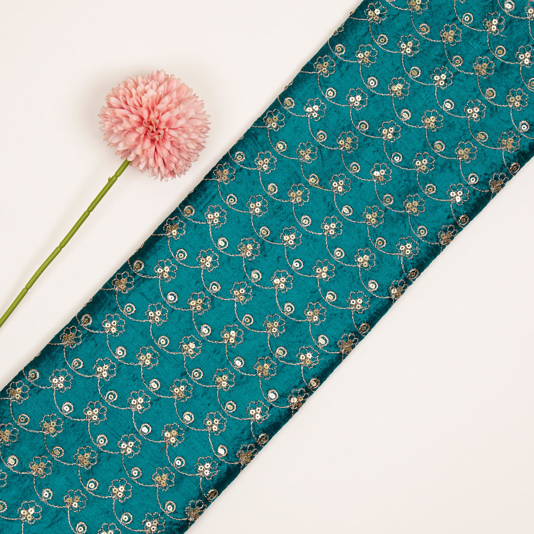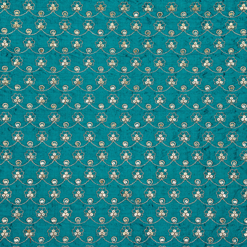 Gulfi Buti on Peacock Blue Raw Silk Embroidered Fabric