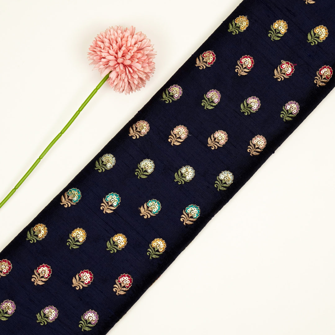 Gulfi Buti on Navy Blue Raw Silk Embroidered Fabric