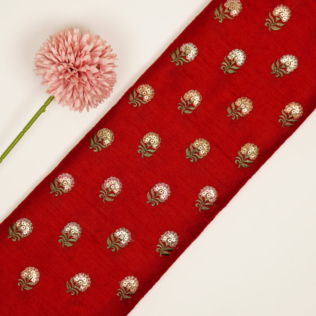 Gulfi Buti on Red Raw Silk Embroidered Fabric