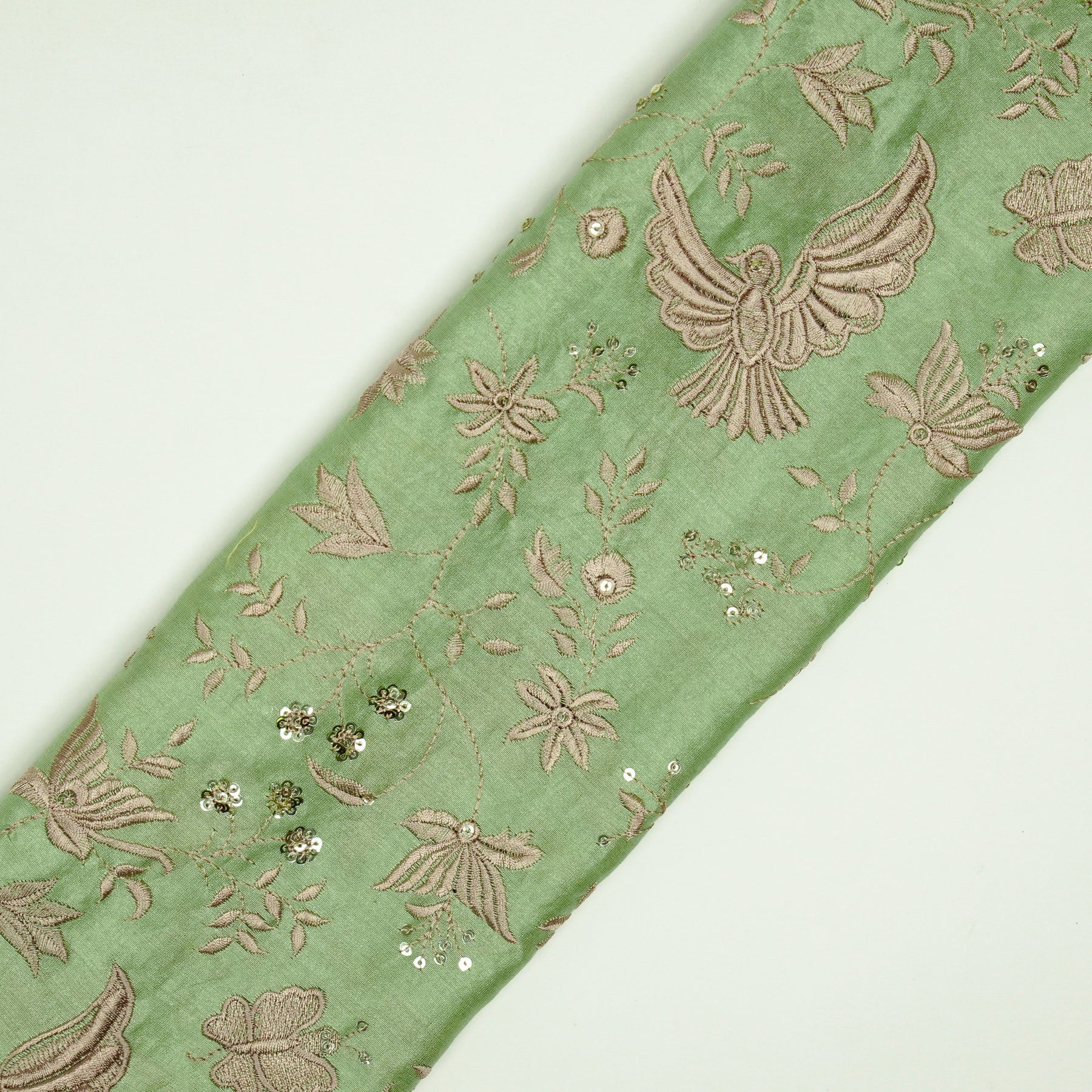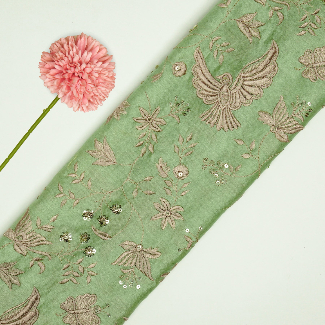 Naila Bird Jaal on Pista Green Luxe Silk Chanderi Embroidered Fabric