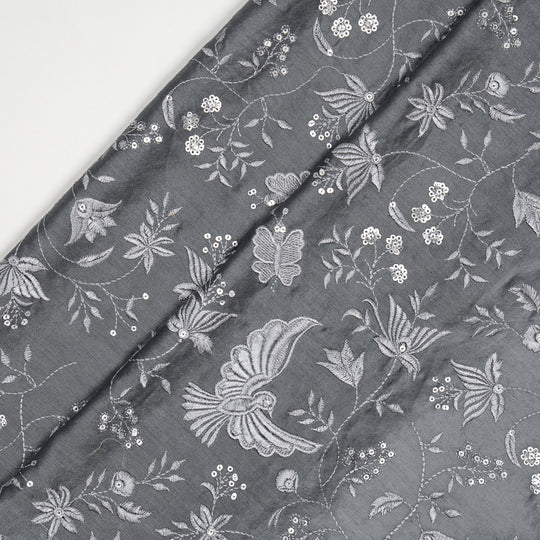 Naila Bird Jaal on Silver Grey Luxe Silk Chanderi Embroidered Fabric