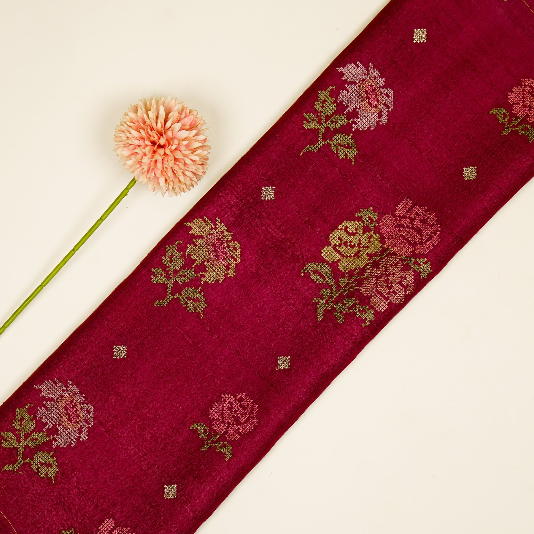 Noorain Buta On Magenta Tussar Silk Embroidered Fabric