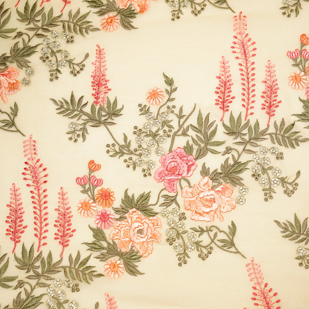 Nawabi Floral Jaal on Ecru Semi Georgette Embroidered Fabric
