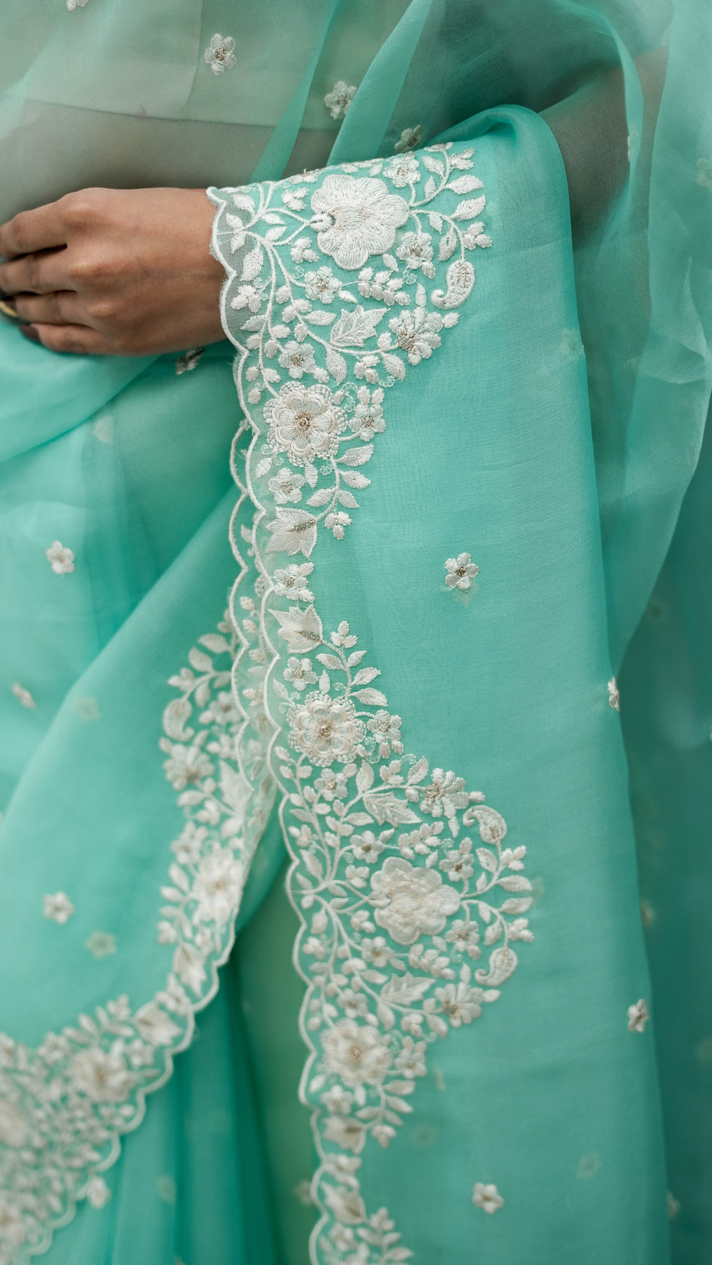 Vrinda Embroidered Saree on Turquoise Pure Silk Organza