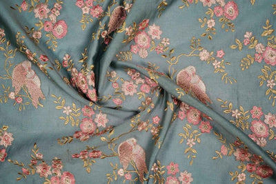 Akshara Jaal on Light Teal Silk Linen Embroidered Fabric