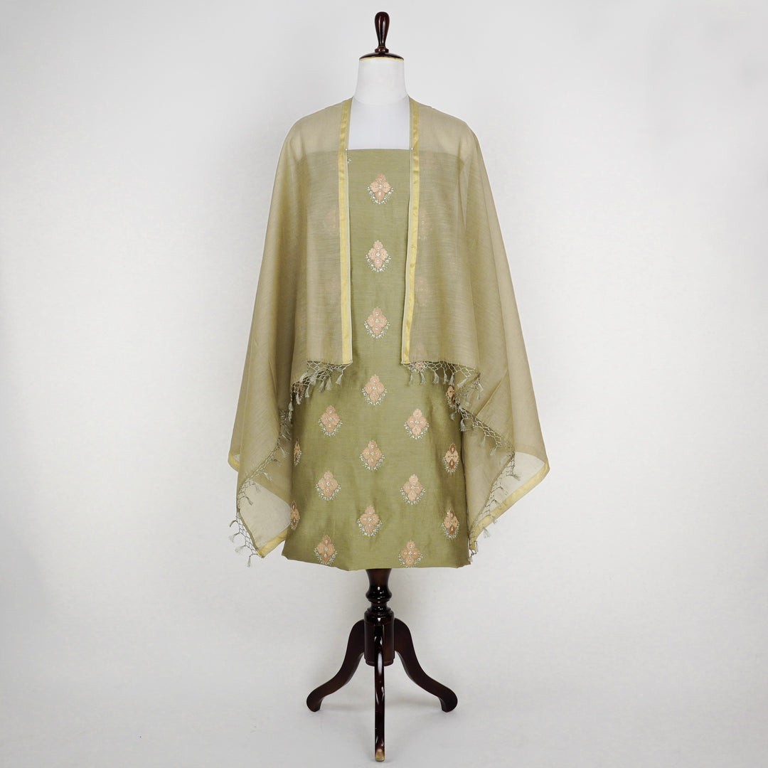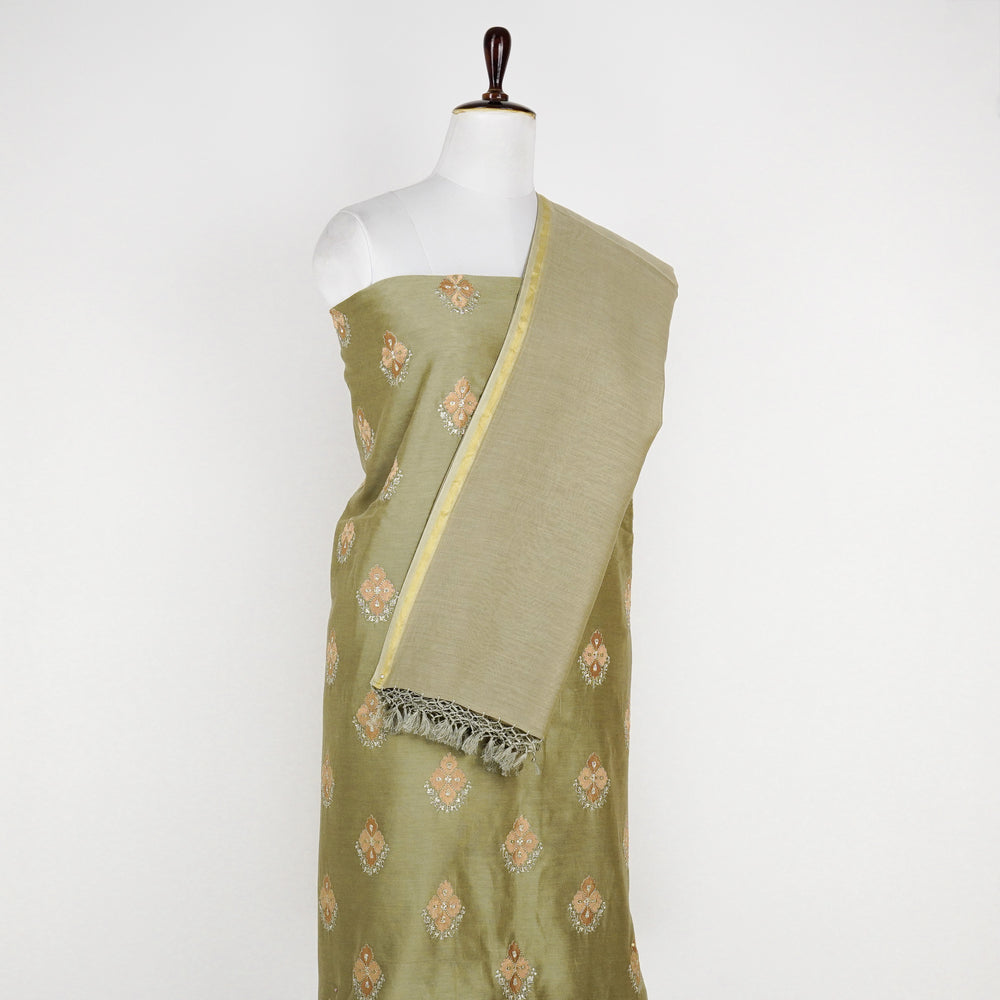Inaya Jaal On Suit fabric Set on Silk Chanderi (Unstitched)- Olive Green